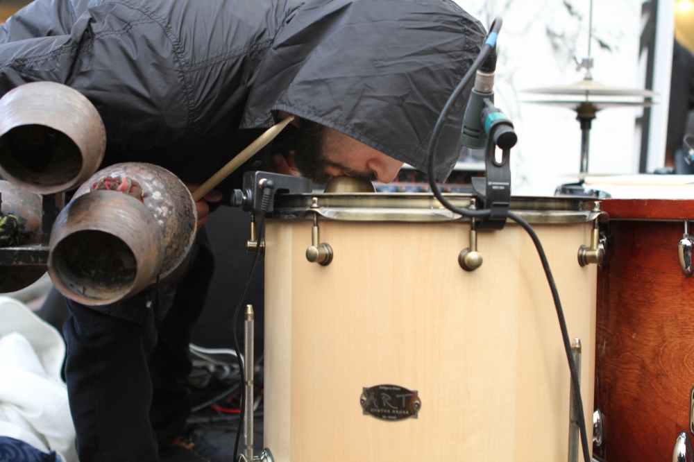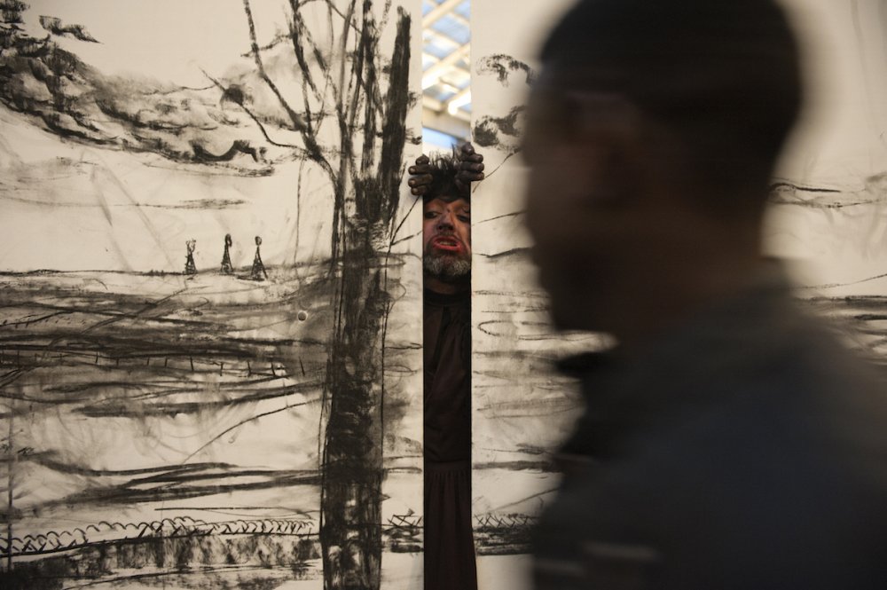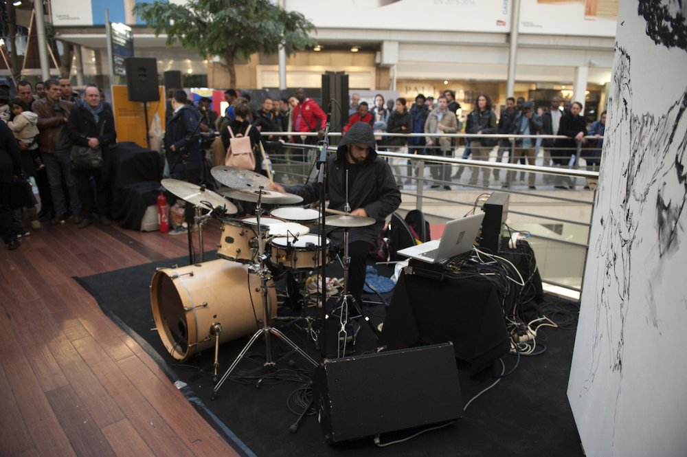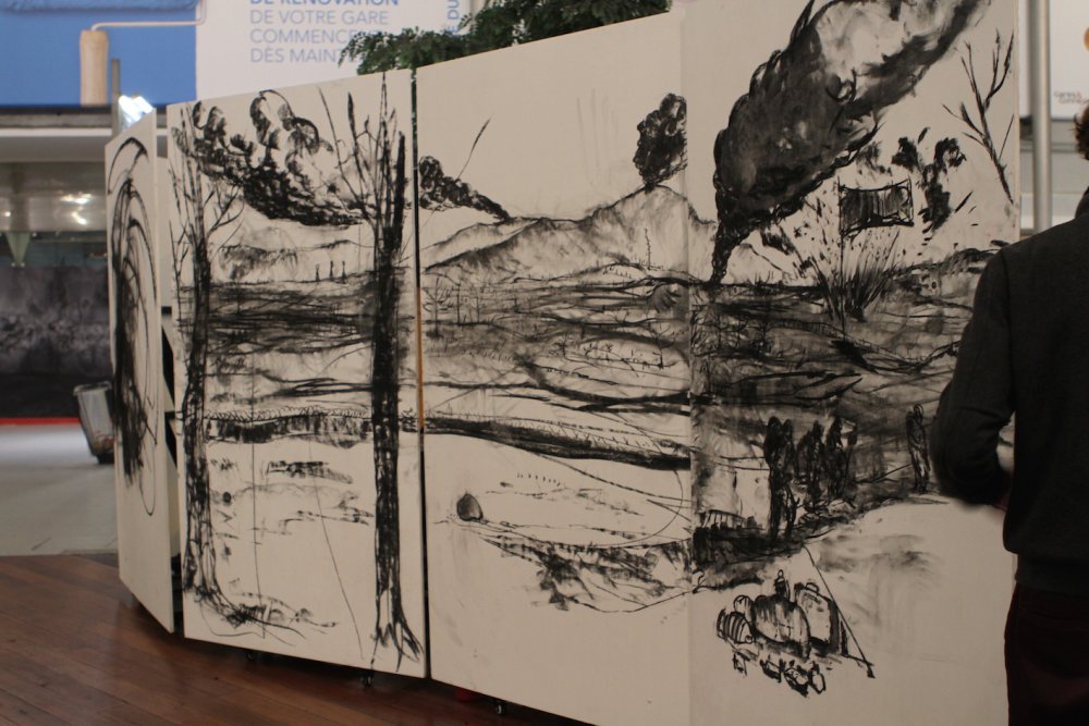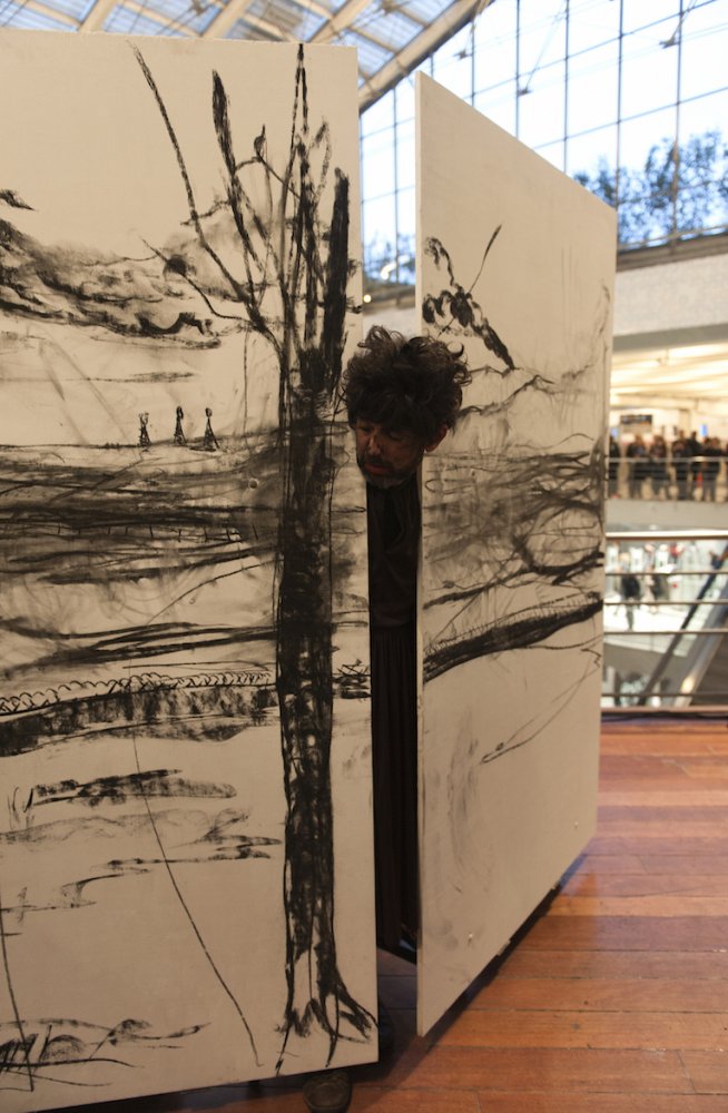 During a 3-hour performance, they developped a narrative symbolising the conditions of refugees in France and Europe. Taking advantage of this unusual context, with an extremely broad population coming and going, they used the huge resonating chamber that the train station represents as a site of mental projection. Their respective characters occupied a territory that they only could leave by way of their expressions, glistening like the distant shores that always appear more cheerful when seen from the other side of the sea…