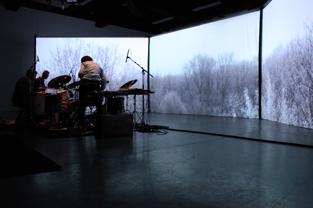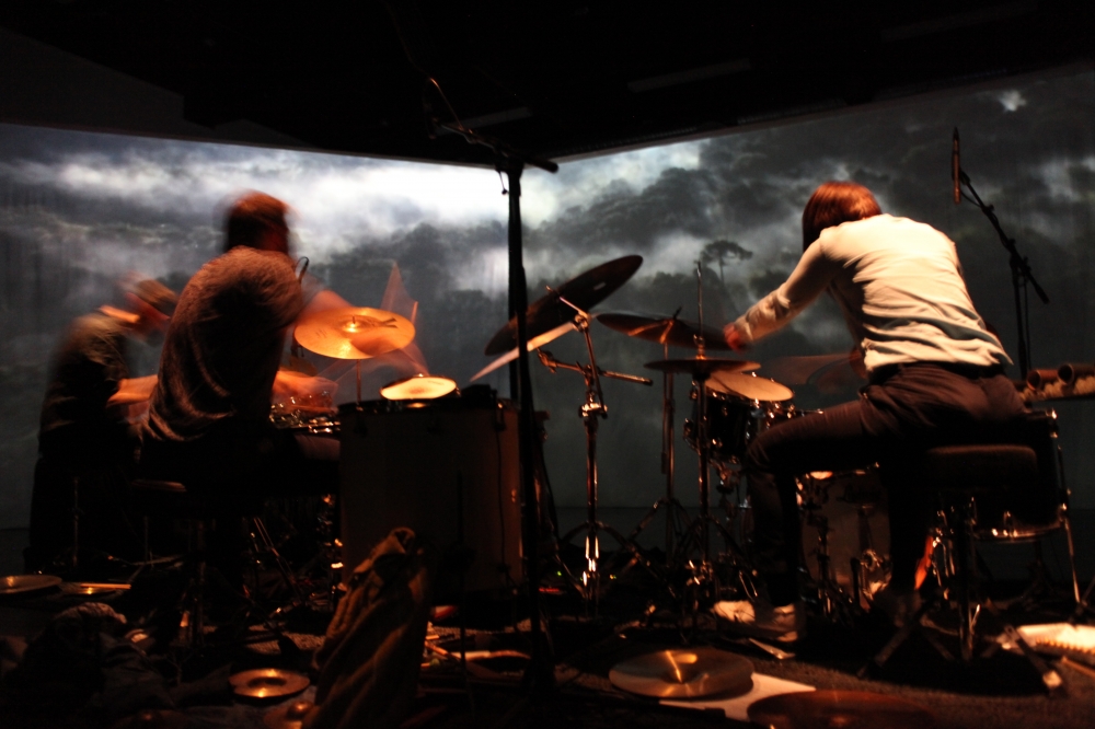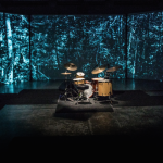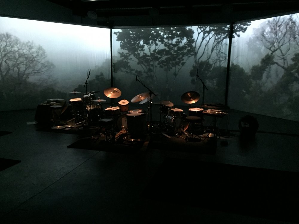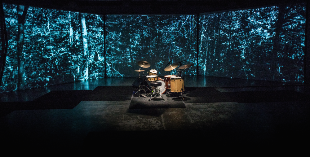 A drum kit eqquiped with sensors systems is positioned in the middle of the set-up. It can be accessed by the audience, allowing them to have an influence on the sound and image by playing or simply touching it.