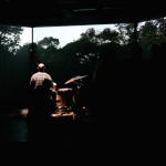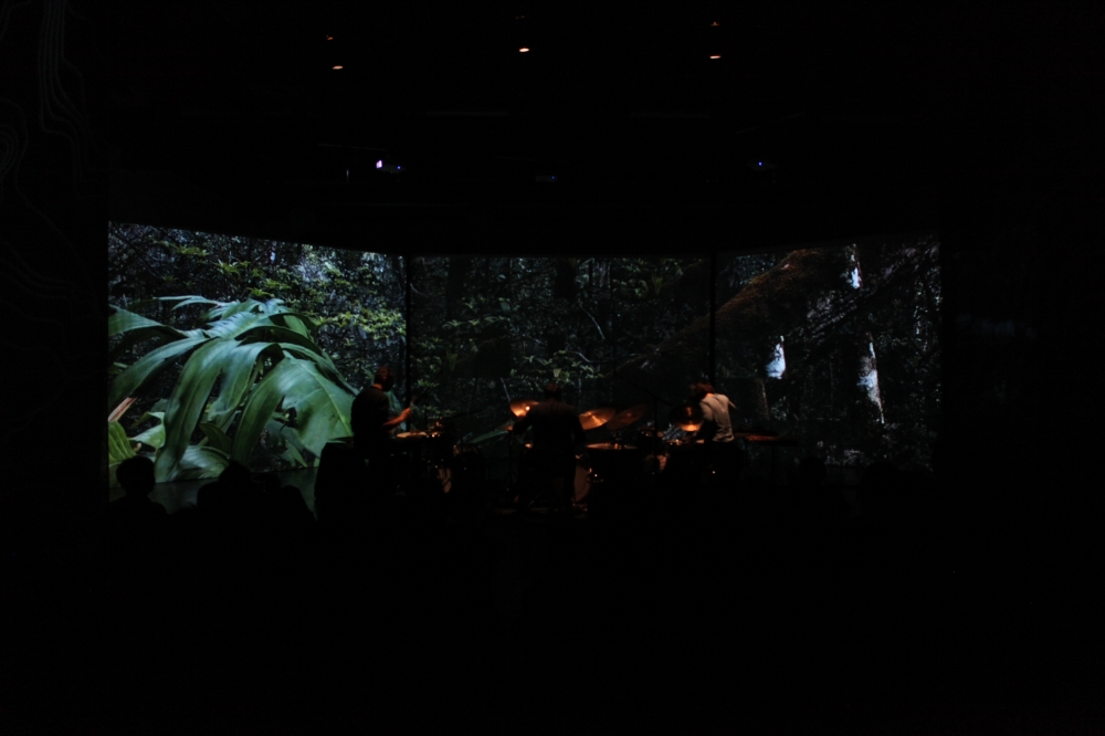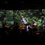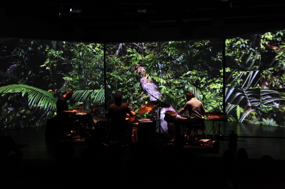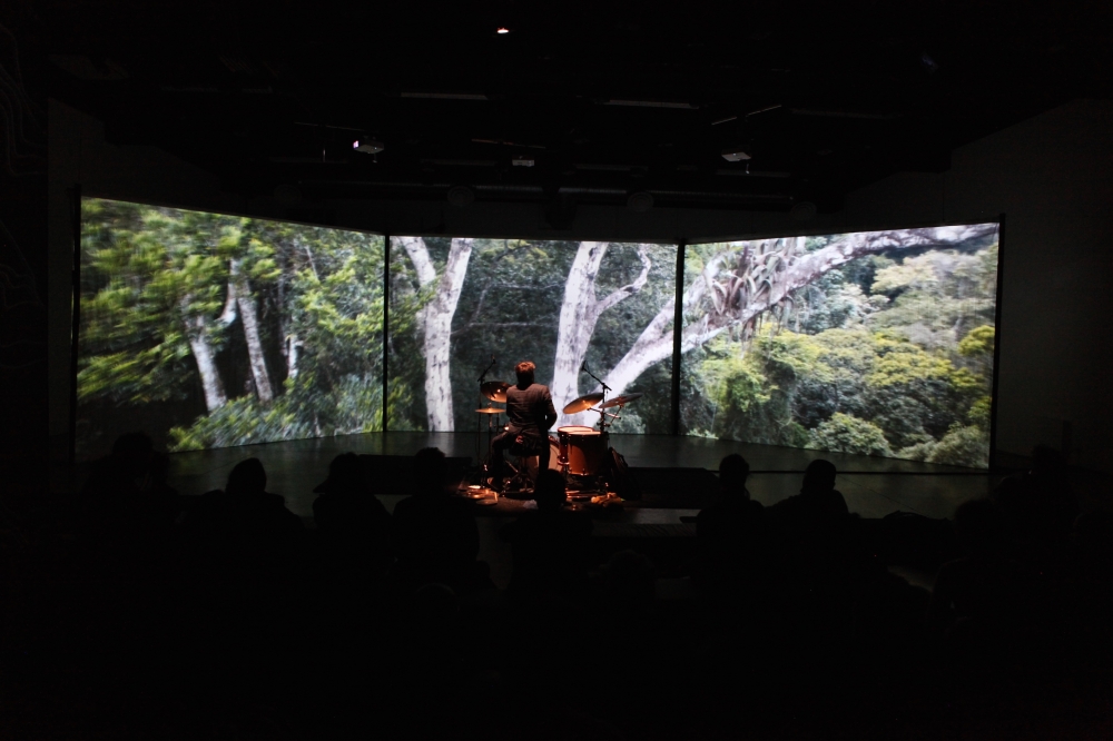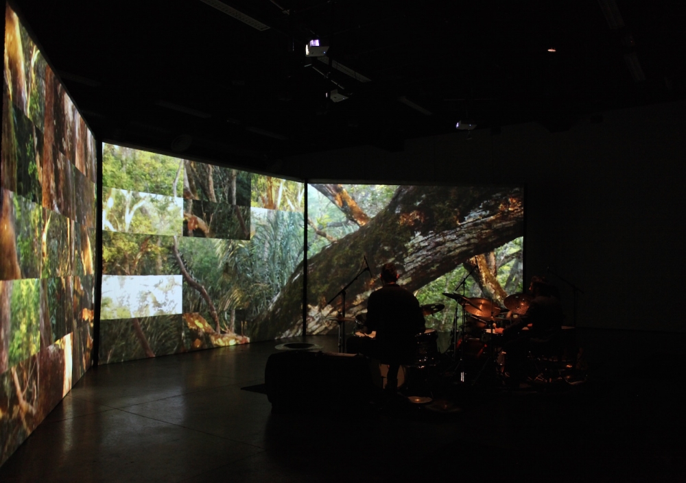 The videos, classified by banks ( types of forests, vegetations, etc…) are played thru different protocols, depending on the electro-acoustic sound, or playing generated by the drums.