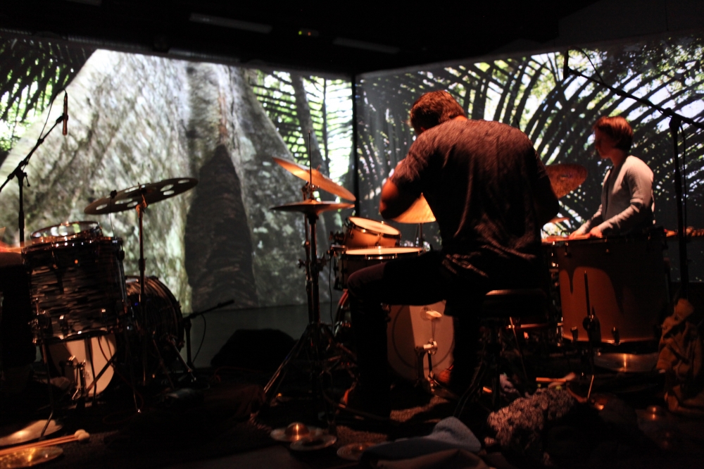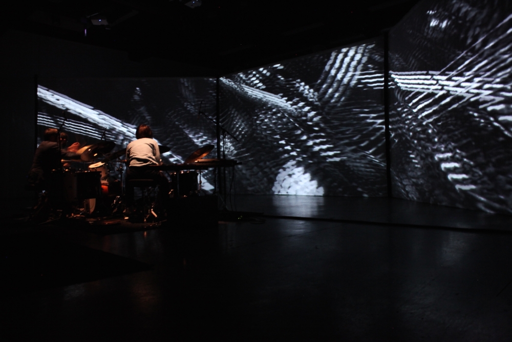 Une application générative son/image autonome permet d’analyser le jeu durant les performances, transformant les données générées par la batterie en «résonances», traces qui orientent le recit de l’image plusieurs jours après. Les interactions créent ainsi plusieurs espaces temps simultanés se déroulant à différents niveaux.