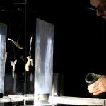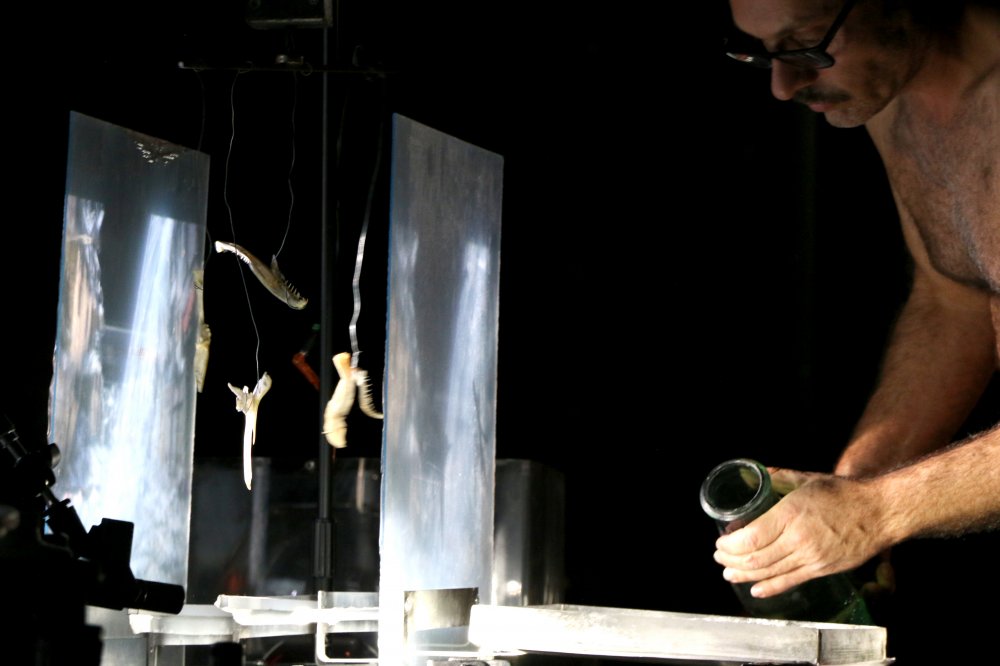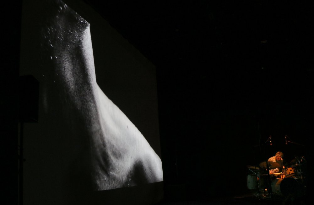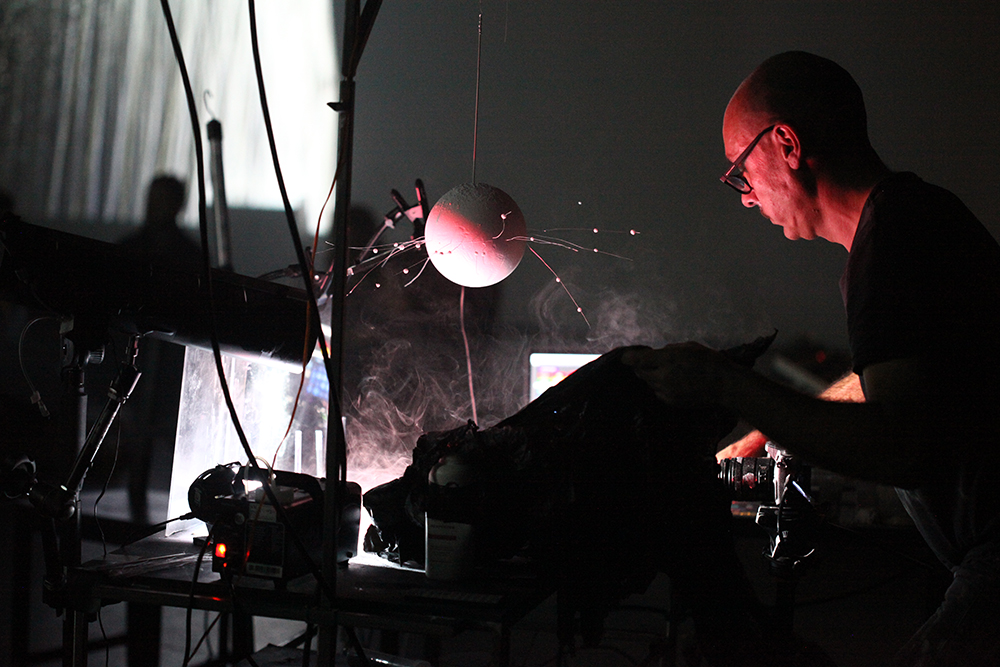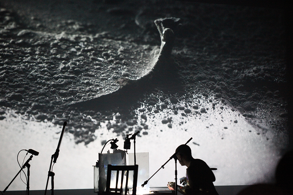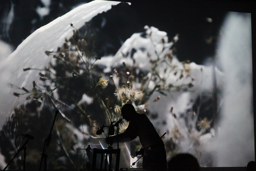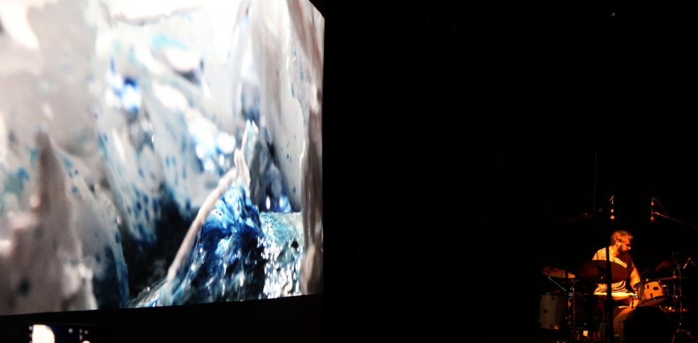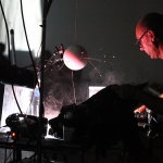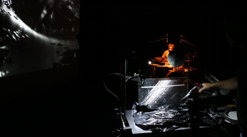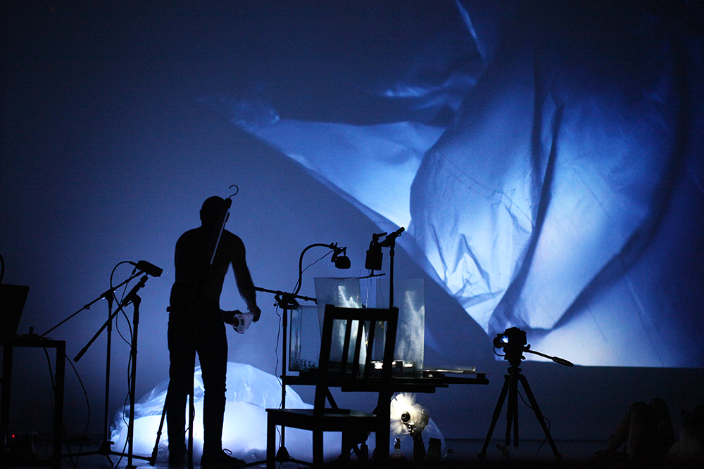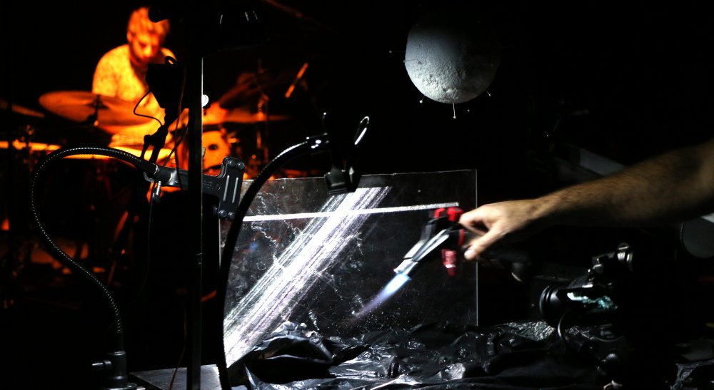 A l’intérieur d’un dispositif étalé dans l’espace, les deux artistes créent et manipulent leurs matières sur le plateau, mélangeant organique et numérique, acoustique et électronique. Une première partie analyse les univers véhiculés par les outils numériques et la pensée fascisante qu’ils induisent, pour faire, en deuxième partie, une tentative de réponse par un voyage sonore et visuel coloré, dense et vivant au possible, frisant la transe et cassant les codes jusqu’à inviter les spectateurs à entrer dans une danse libératrice.